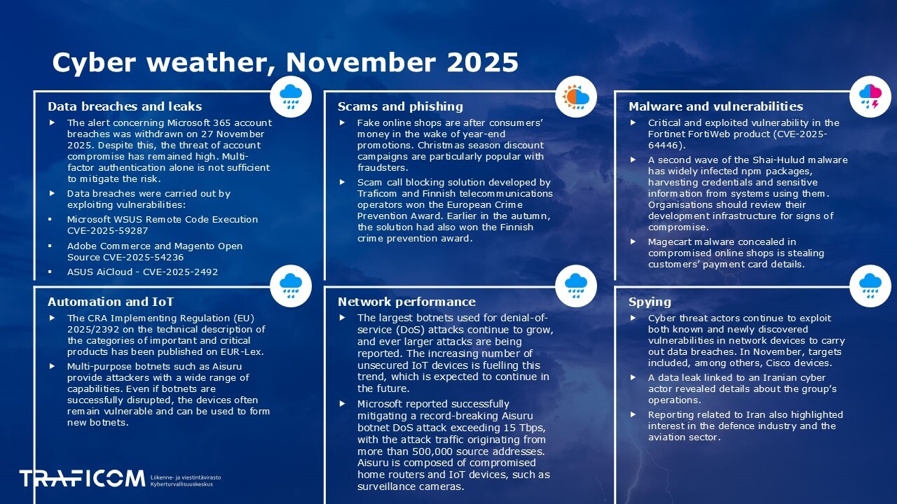 The Cyber Weather in November remained generally rainy, even though the month was overall relatively calm. Conditions were weakened mainly by observations related to malware and vulnerabilities.