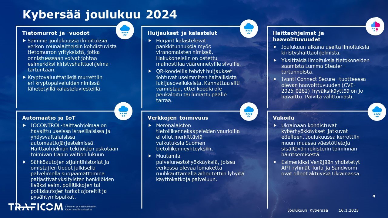 Joulukuussa havaittiin verkon reunalaitteisiin kohdistuneita tietomurron yrityksiä ja kiristyshaittaohjelmia. Lisäksi viranomaisten nimissä tehtiin tietojenkalastelua ja erilaiset huijaukset jatkuivat. Viranomaisten tehokas yhteistyö ja yhteiskunnan varautumisen hyvä taso näkyivät jälleen, kun 25.12.2024 tapahtunutta merikaapeleiden vauriotapausta ryhdyttiin selvittämään.