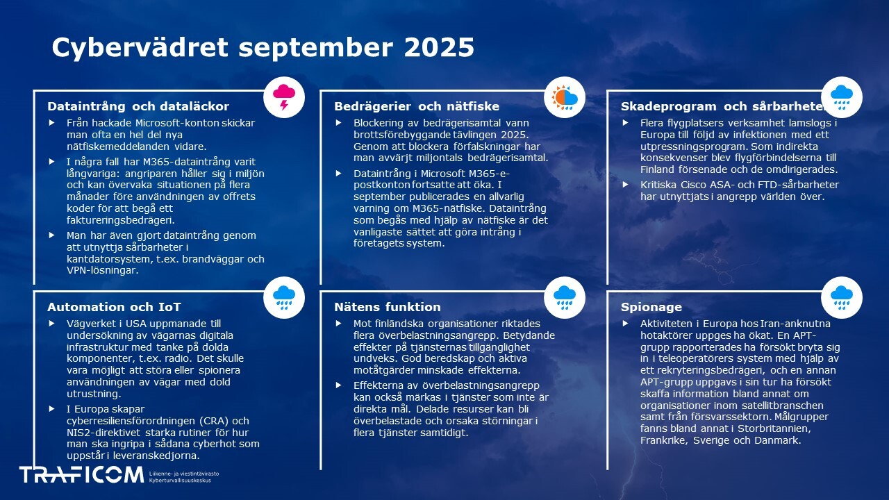 September var en ganska aktiv månad i fråga om cybersäkerhetsincidenter och vädersymbolerna vände i en något svagare riktning. Bland annat ett cyberangrepp som störde europeiska flygplatsers verksamhet och överbelastningsangrepp som observerats i Finland fick uppmärksamhet i medierna.