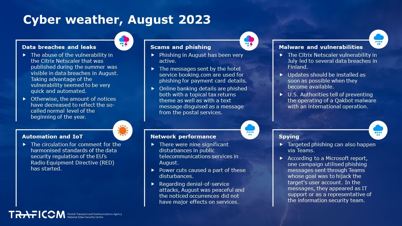 In August, the cyber weather was autumnally rainy. Phishing was very active, and the Citrix NetScaler vulnerability led to several data breaches in Finland. Taking advantage of the vulnerability seemed to be quick and automated. Updates should be installed as soon as possible whenever they are available.