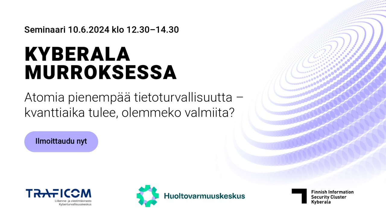Kyberala murroksessa -webinaarisarja jatkuu 10.6.2024 klo 12.30-14.30. Miten kehitteillä oleva kvanttiteknologia vaikuttaa kyberturvallisuuteen? Millaisia uhkia, mutta myös mahdollisuuksia kvantti tarjoaa kyberturvallisuuden kehittämiseen ja uhkiin vastaamiseen? Miten viranomaisissa ja yrityksissä ollaan valmistauduttu kvanttiaikaan?