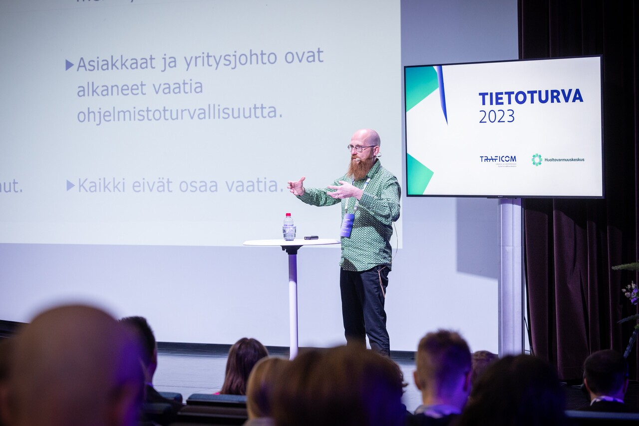 Tietoisuus ohjelmistoturvallisuuden merkityksestä on kasvanut, mutta osataanko sitä kaikkialla vaatia? Mitä oikeastaan pitäisi vaatia? Lavalla Traficomin Kyberturvallisuuskeskuksen johtava asiantuntija Juhani Eronen.
