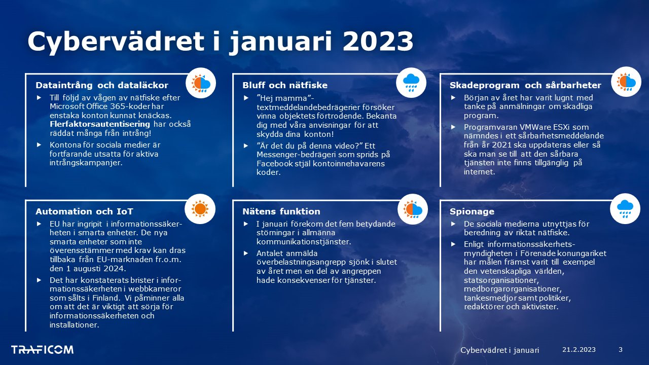 Fenomen i Cybervädret följs upp och de närmare observationerna finns redan i Veckoöversikterna så att information kan delas ut så snabbt som möjligt. Sammanfattningen för månaden finns i början av cybervädret. De varningar och relevanta händelser som meddelats under månaden, t.ex. frågor som Cybersäkerhetscentret främjat, har sammanställts i ett särskilt avsnitt. Sidan Allmän översikt över cybersäkerheten ger en kort beskrivning av den senaste månaden. Vi har försökt förnya Cybervädret på ett sådant sätt att innehållet förblir likartat som tidigare men nu finns det fler diagram och åskådliggörande delar utan att kompromissa med tillgängligheten.